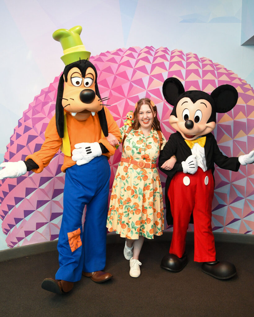 Although I have certainly gone all out when Disneybounding before (my Orange Bird Disneybound is a perfect example), your outfit doesn’t have to be too complicated, either. I once wore a purple skirt, black shirt, and seashell necklace (Disneybounding as Ursula) to meet Sorcerer Mickey before Fantasmic!. We had an entire conversation about how I had accidentally stolen his voice and how I would need to get it back to him before the show.